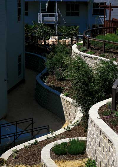 Miller felt that, “Design flexibility and constructibility were the primary considerations for choosing the StoneWall SELECT units. This segmental retaining wall system allowed us to make use of this difficult site in a way that is both functional and pleasing to the eye. The size of the unit allows complex layouts, such as the curved walls required by this design, to be easily constructed. Using StoneWall SELECT retaining walls adds an additional level of interest to the site.” The scale blends beautifully with the residential community which the gardens serve. Miller created an amphitheater, with some of the walls providing seating, while preserving a sense of intimacy. |